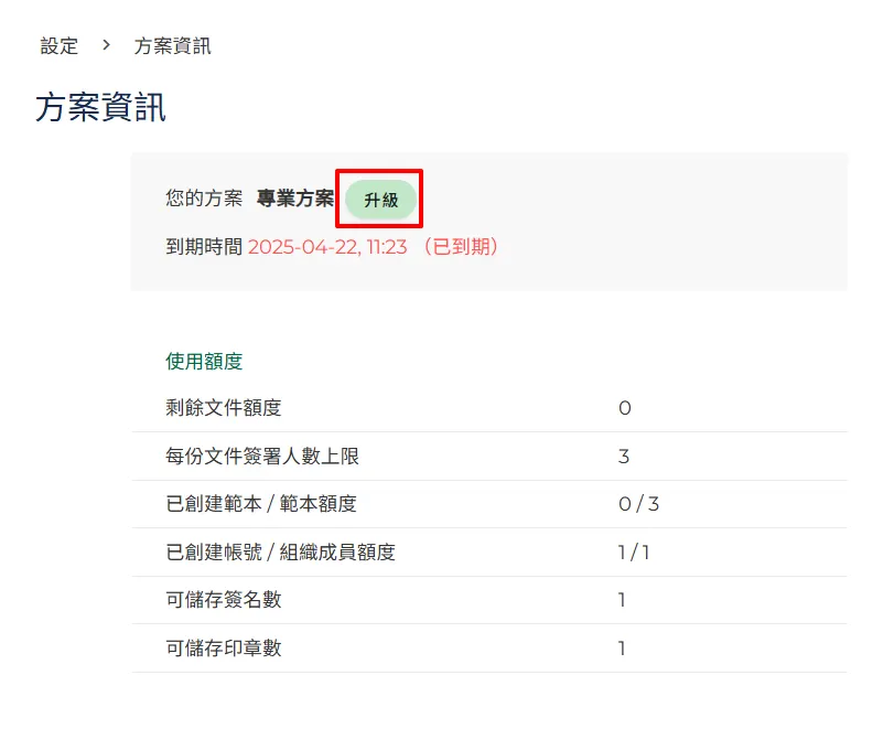 若目前方案已經到期沒有續約,則無法重新恢復訂閱。請點擊【升級】按鈕重新訂閱新方案。