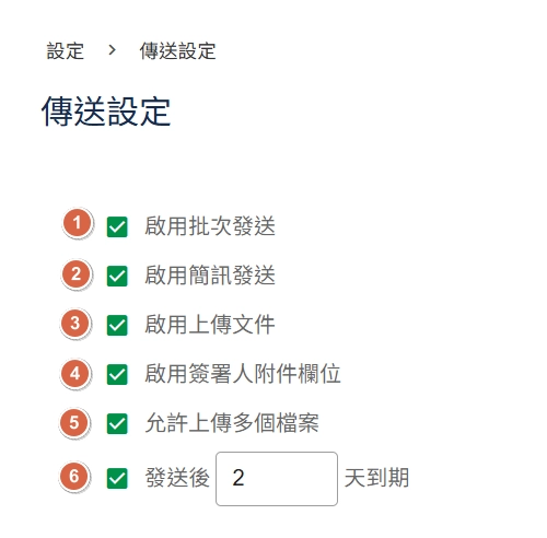 (6) 發送後___天到期:開啟後,可設定文件要在發送後的幾天之後到期(天數可設定為 1~30 天)。 例如:當建立並發送簽署任務時,若設定為 2 天,系統會自動將到期時間設為發送後 2 天; 關閉此功能後,則可在發送任務時自行設定到期時間。