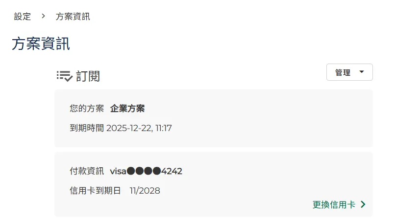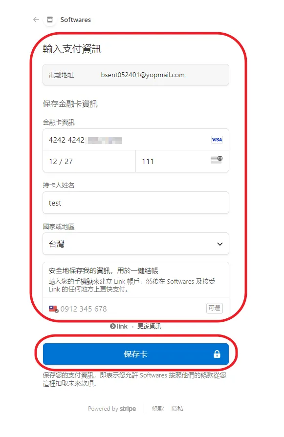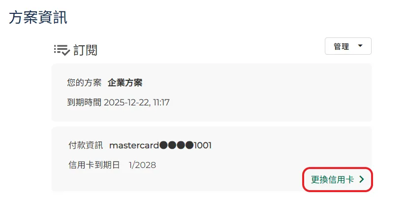 於畫面中輸入要更換的信用卡資訊後,點擊【保存卡】按鈕,就可以完成更換。下一次的訂閱將會以此更換後的信用卡自動付款。