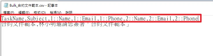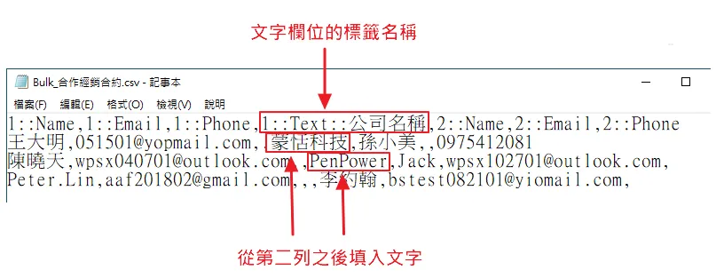 3.若原本簽署文件裡的文字欄位有設定標籤名稱,則CSV檔案中的欄位標題將會自動帶入該文字欄位的標籤名稱,一樣從第二列之後依序填入文字內容。