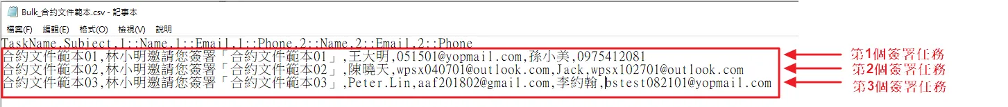 2.從第二列之後依序填入任務名稱、通知信件主旨、簽署人的姓名、Email、電話的資訊。每一列簽署人資料代表著一個簽署任務。