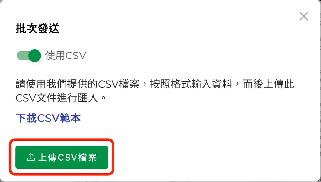 5.回到使用範本頁面,點擊【上傳CSV檔案】按鈕,將剛才的檔案上傳。
