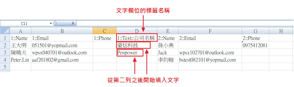 8.若原本簽署文件裡的文字欄位有設定標籤名稱,則XLSX範本檔案中的欄位標題將會自動帶入該文字欄位的標籤名稱,一樣從第二列之後依序填入文字內容。