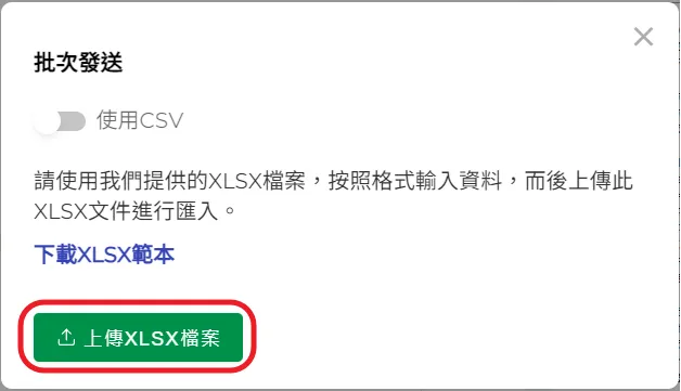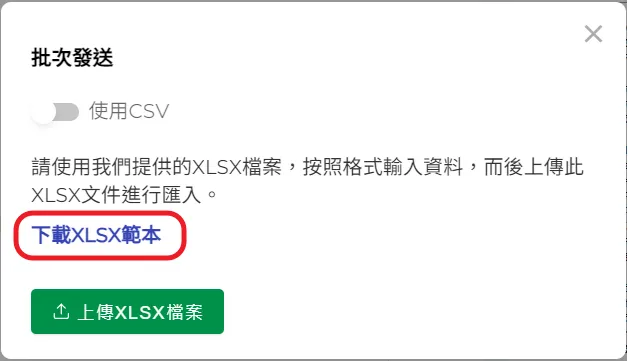 2.點擊【批次發送】按鈕後,依操作說明先點擊【下載XLSX範本】。