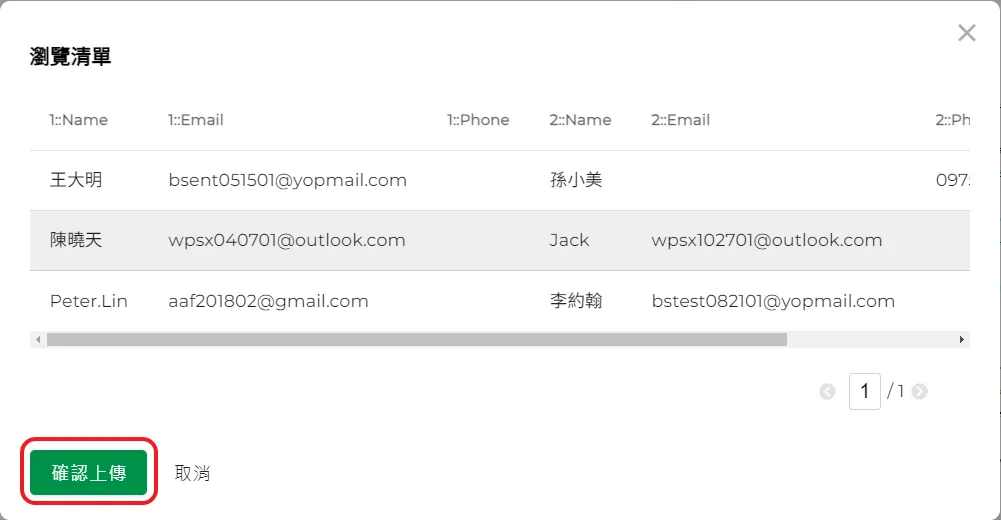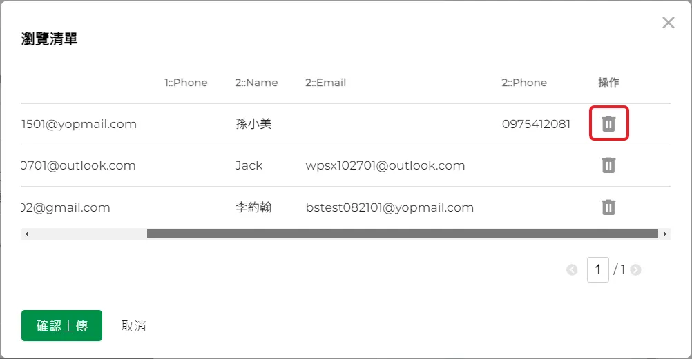 11.上傳完成後,可以瀏覽清單內的簽署人資料是否正確無誤,每一列資料都有一個刪除按鈕,可以將資料刪除。