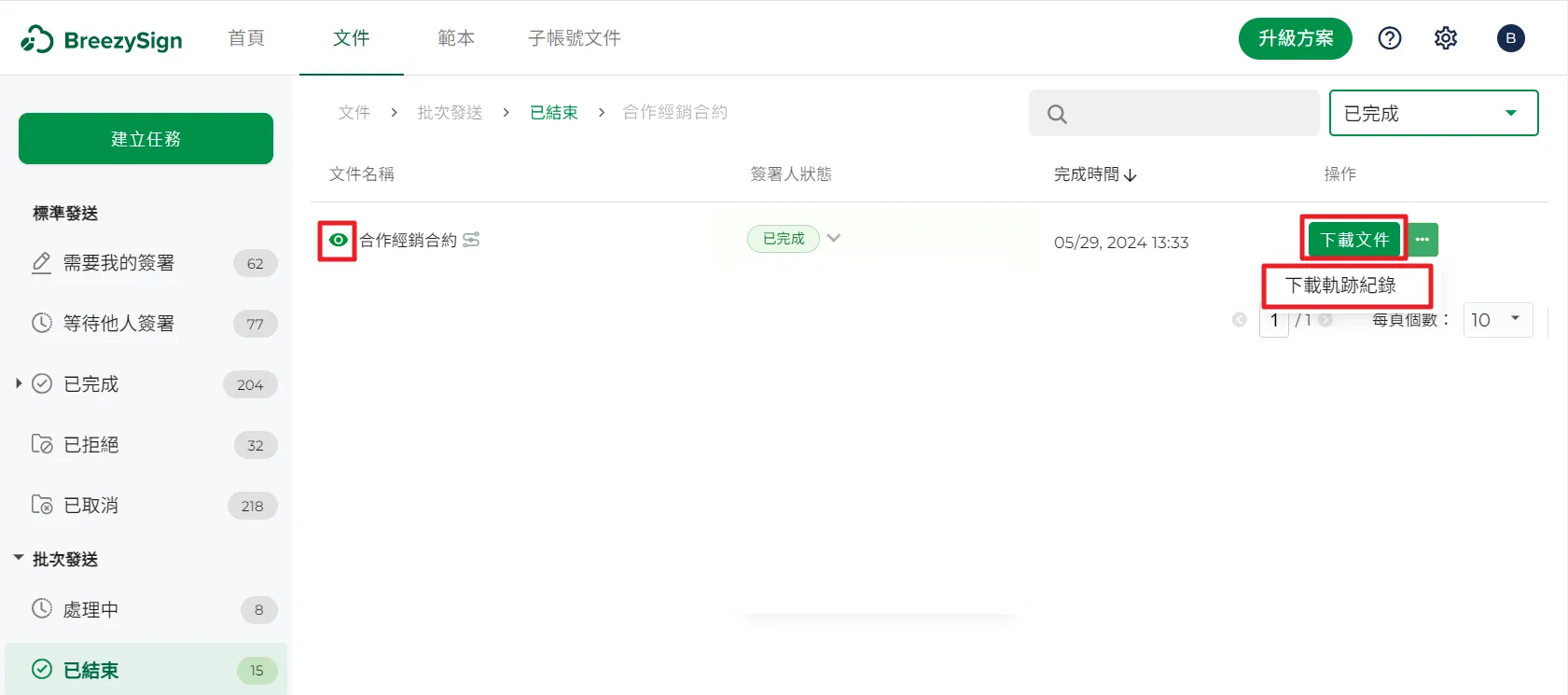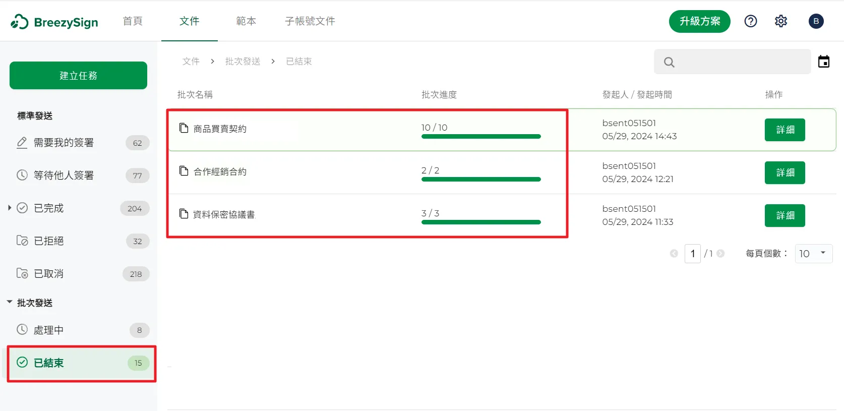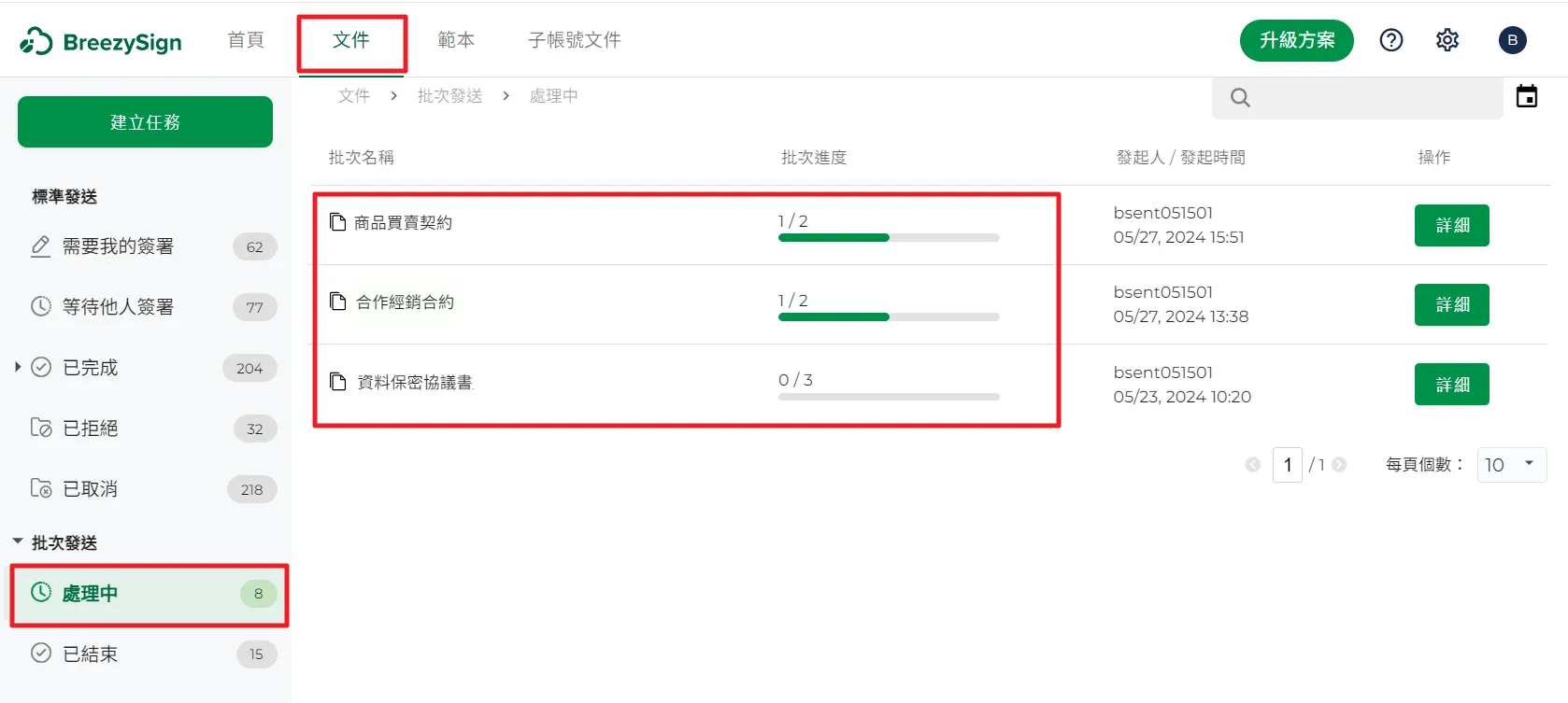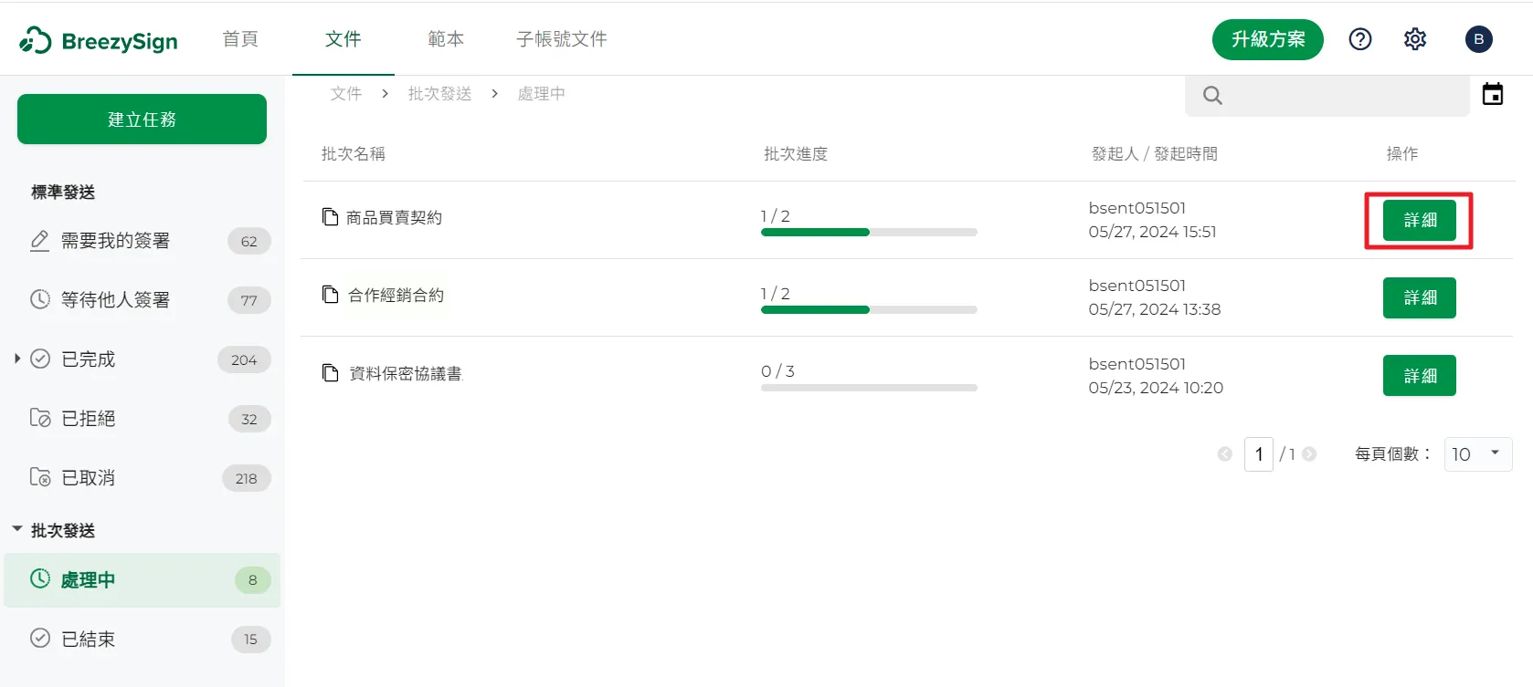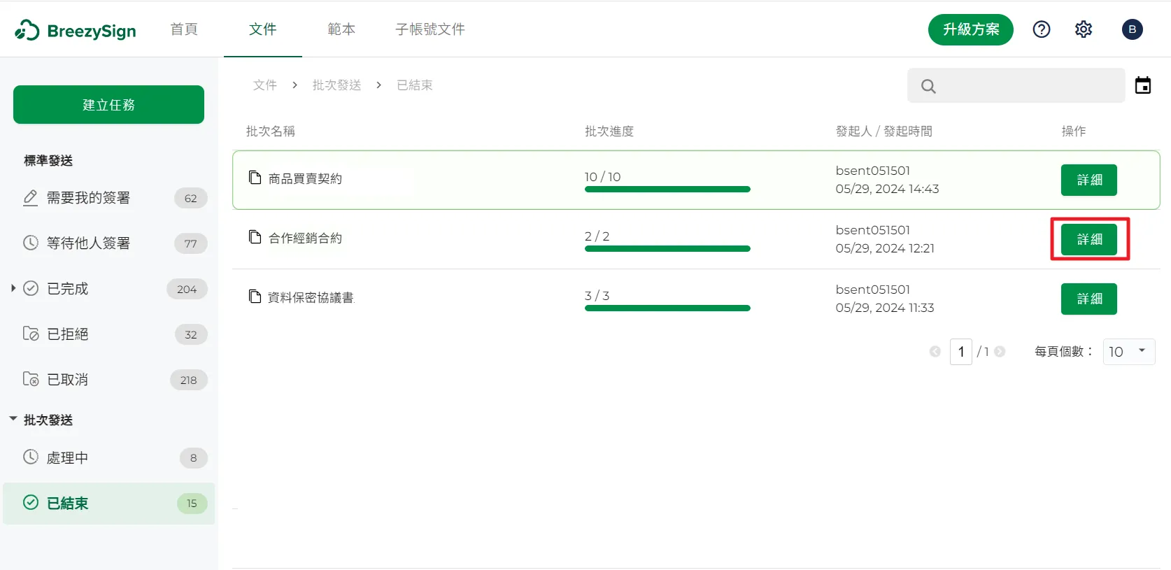 16.選取你想要查看的批次任務,點擊最右側的【詳細】按鈕,可以查看批次任務中的每一份簽署文件。
