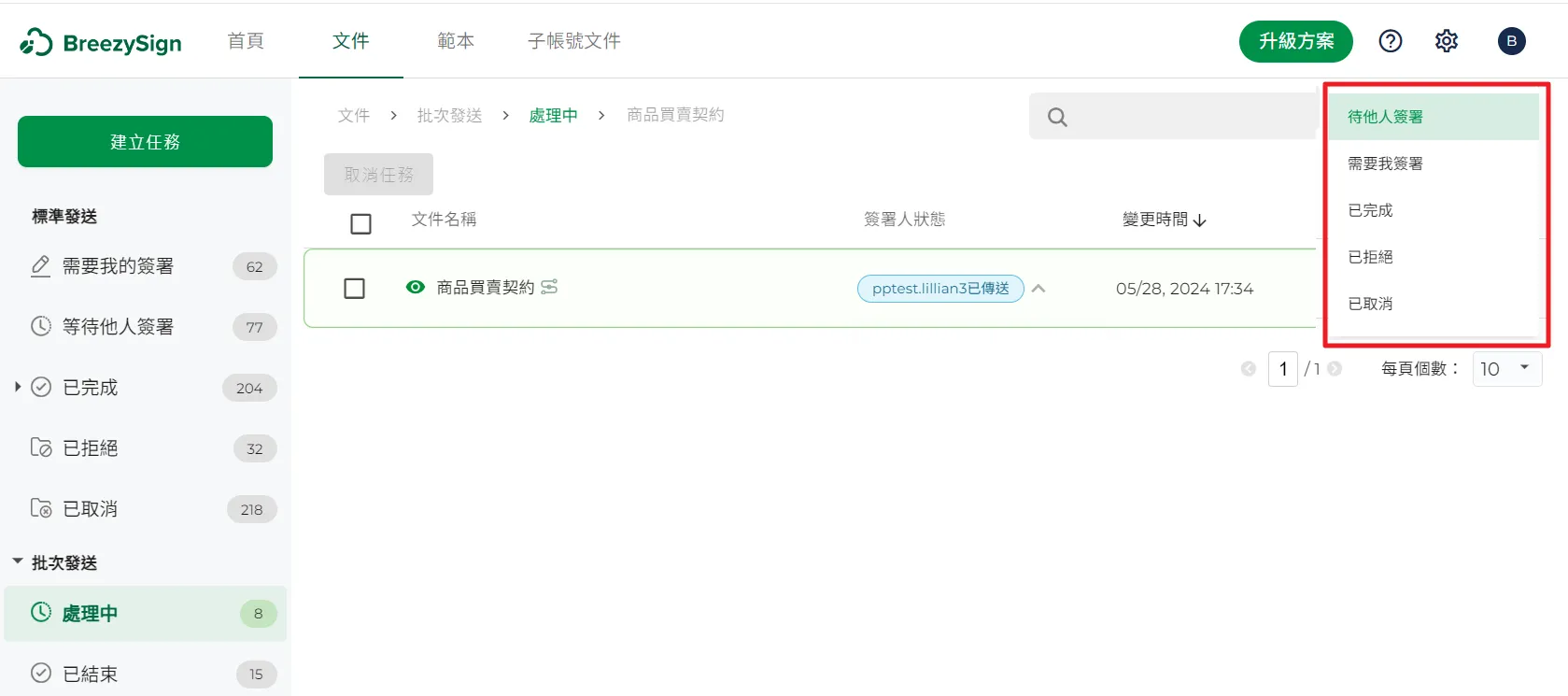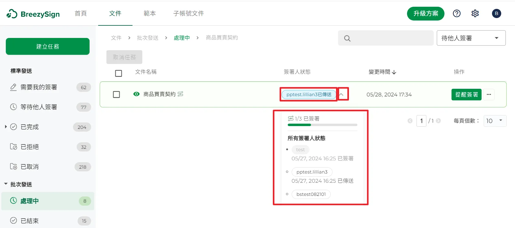 15.當發起人想要檢視文件簽署狀態時,可以切換到文件頁面,左邊批次發送選擇【處理中】狀態,在右邊的文件列表中,看到這些批次簽署任務的進度。