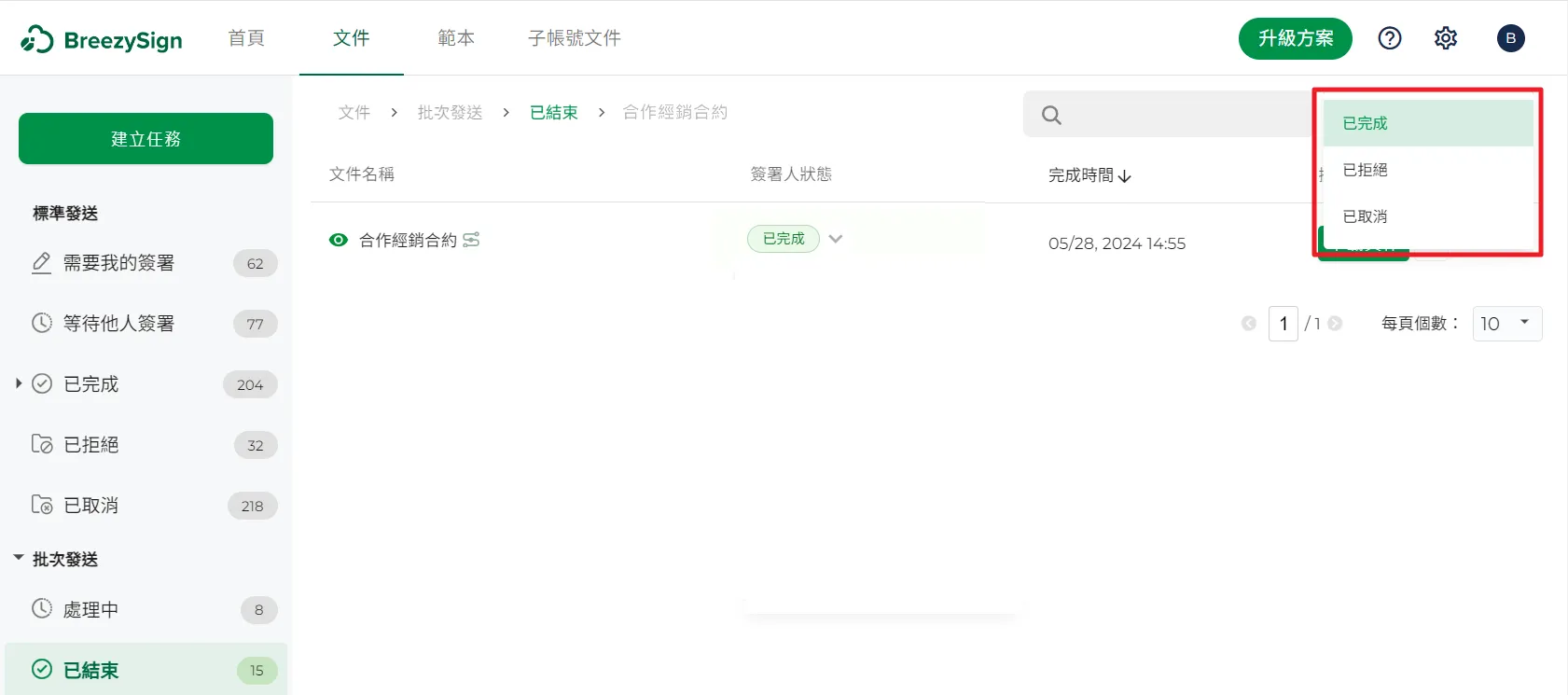 22.可以在頁面右上方切換不同的文件狀態:已完成、已拒絕、已取消。