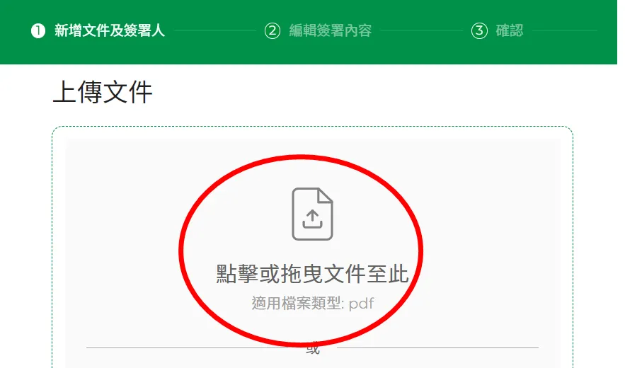 - 點擊或拖曳文件到中間區域,上傳需要簽署的文件,目前只支援pdf 格式檔案,然後按【繼續】鈕。