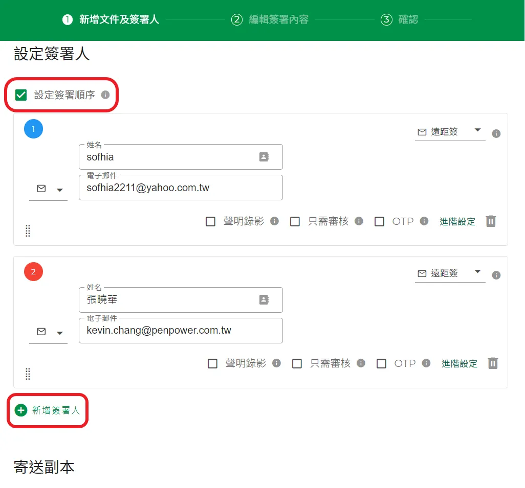 - 點擊【新增簽署人】,可以增加需要簽署的人員。如果勾選【設定簽署順序】,則將依照順序發送簽署文件通知,第一個人完成簽署後,第二個人才會收到簽署文件通知,以此類推.如果沒有勾選【設定簽署順序】,則所有簽署人將會同時收到簽署文件通知,表示此文件不需指定簽署順序。然後按【繼續】鈕。