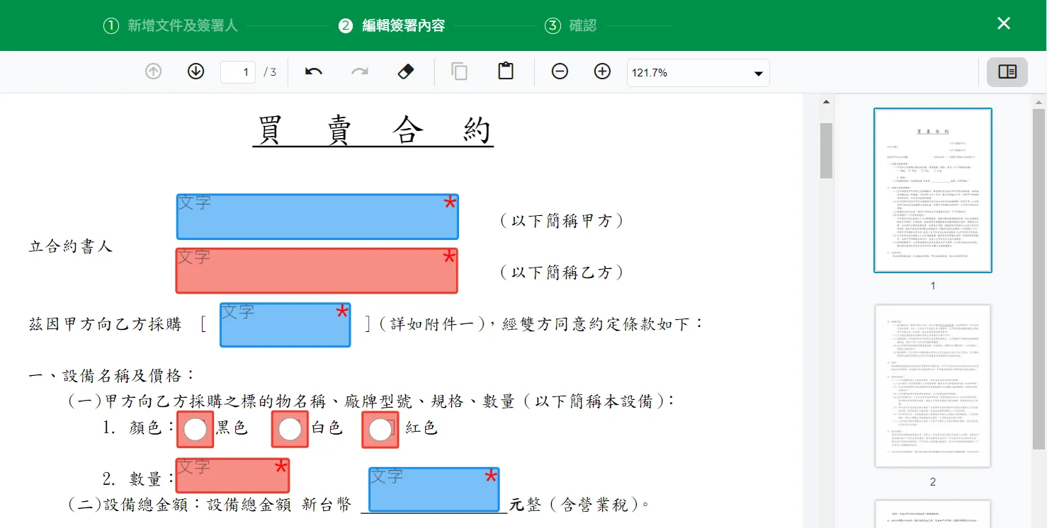 - 新增所有欄位物件後,指定給不同簽署人填寫的欄位,將會以不同的顏色標示。