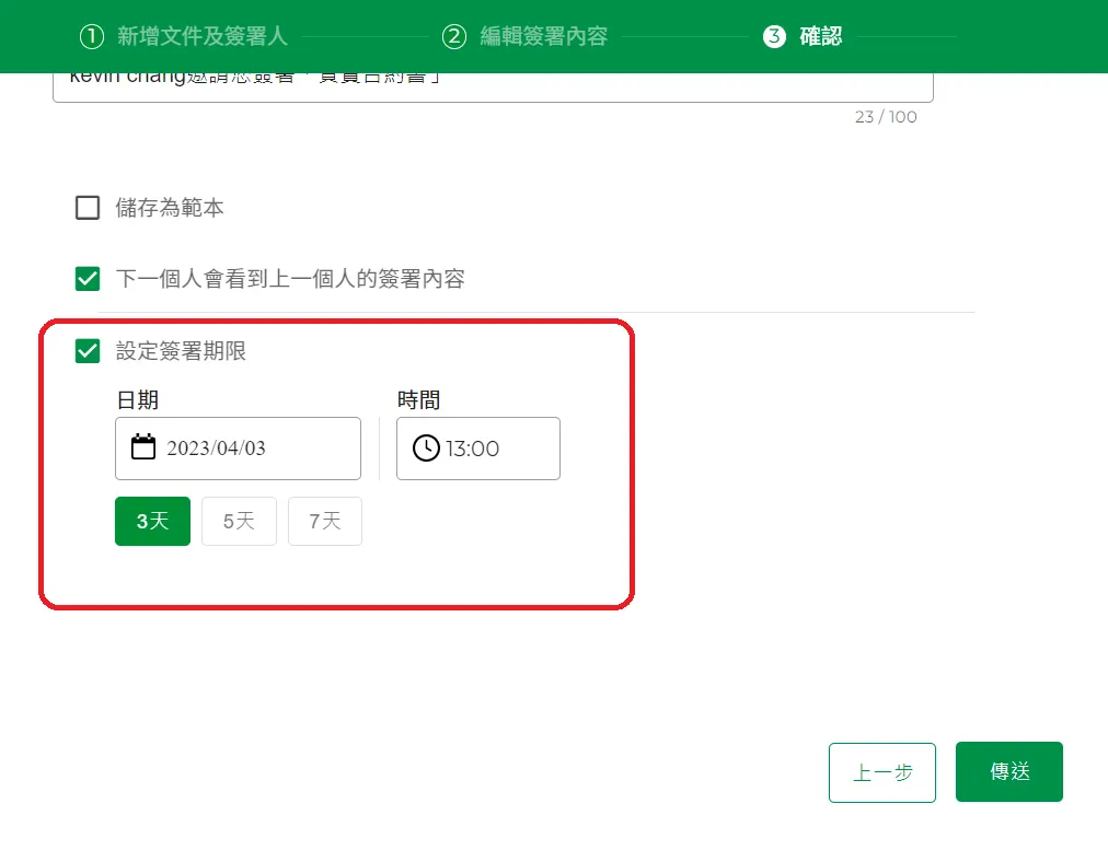 - 你可以設定此文件簽署的有效期限,當過了有效期限,若尚未完成簽署,文件將被取消。