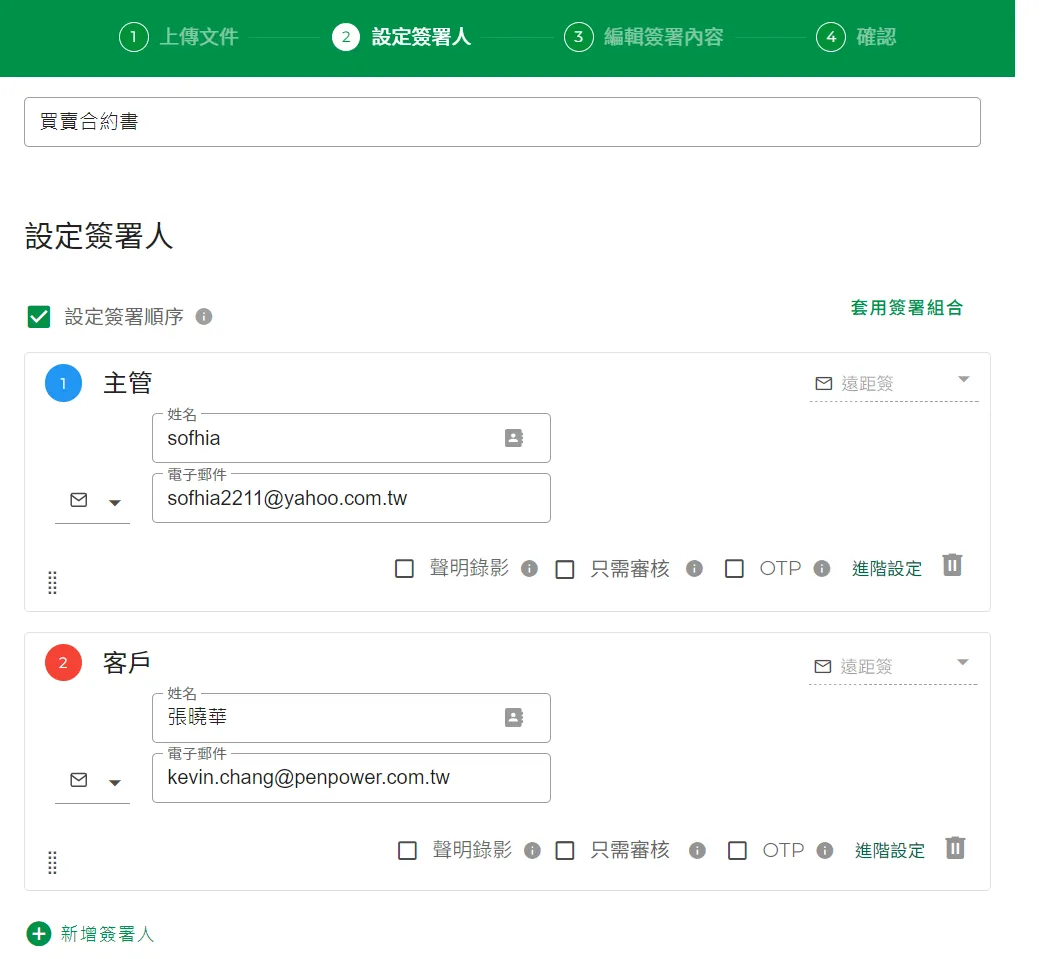 - 將會自動帶出此範本已經設定好的簽署人,可以刪除、修改,或新增簽署人。完成後點擊【繼續】鈕到下一步。