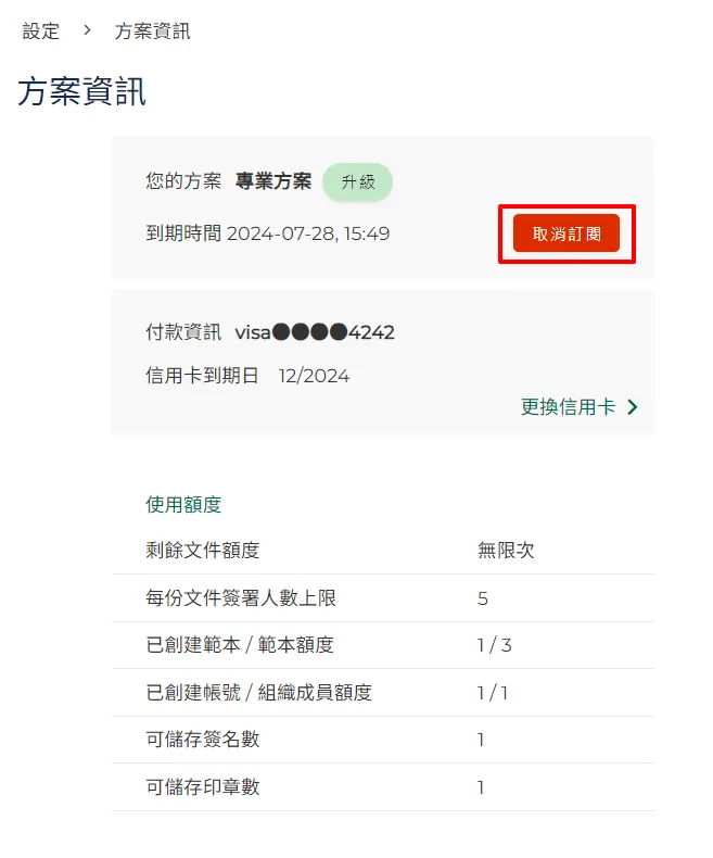 點擊【取消訂閱】鈕,即完成取消訂閱,付費方案於到期日之後,將不再自動扣款續訂。