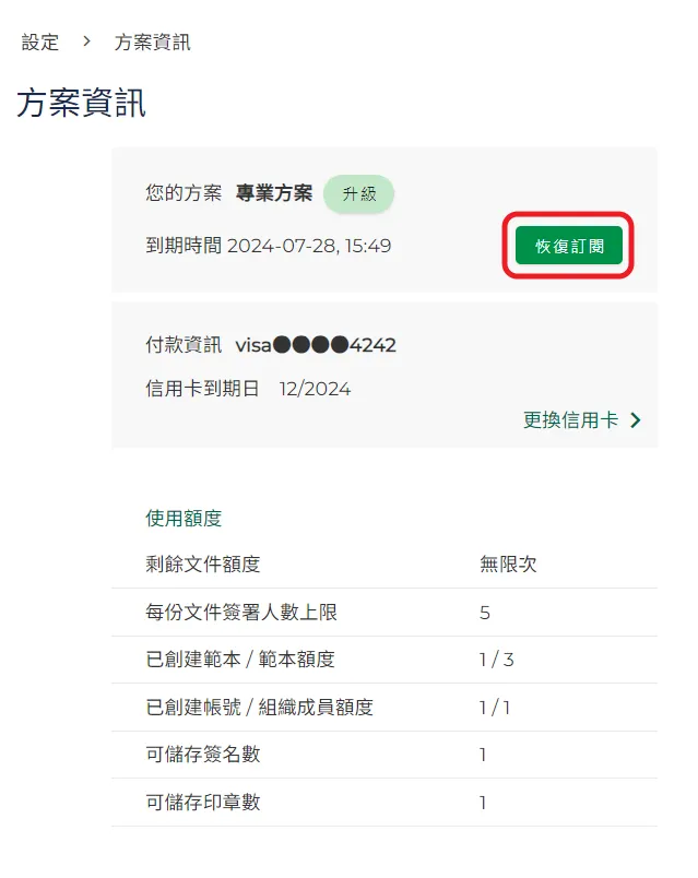 若在取消訂閱後,而且目前方案尚未到期前,仍然可以點擊【恢復訂閱】鈕,回復原先方案的自動訂閱。